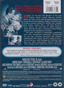 Bogart is Vincent Parry, a prison escapee framed for murder who emerges from plastic surgery with a new face. Bacall is Irene Jansen, his lone ally. |