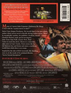 With the disappearance of hack horror writer Sutter Cane, all Hell is breaking loose...literally! Author Cane, it seems, has a knack for description that really brings his evil creepy-crawlies to life. Insurance investigator John Trent is sent to investigate Cane's mysterious vanishing act and ends up in the sleepy little East Coast town of Hobb's End. |